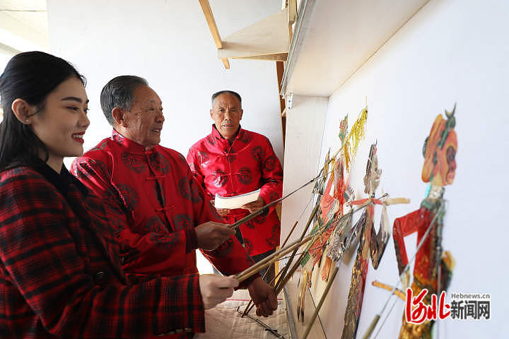 11月15日,唐山皮影戏代表性传承人李绍民(中)与孙女、村民一起表演皮影戏。