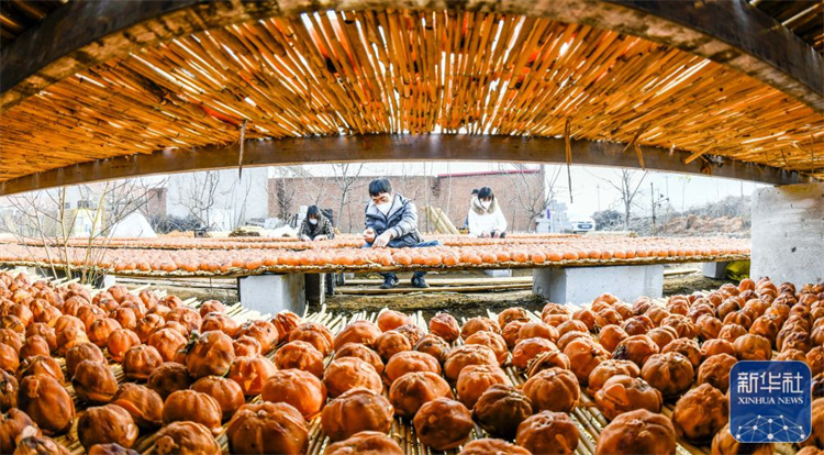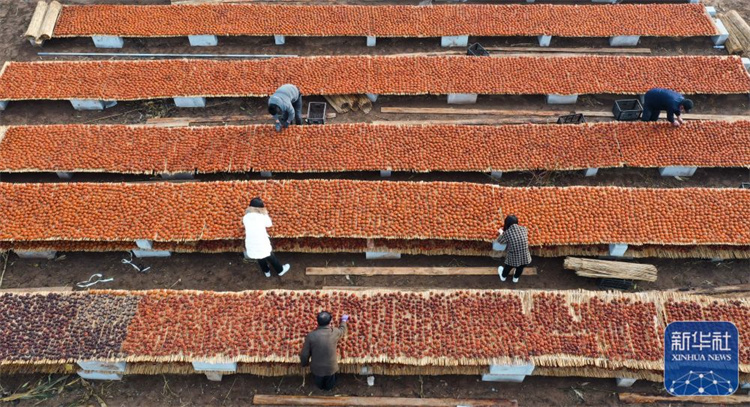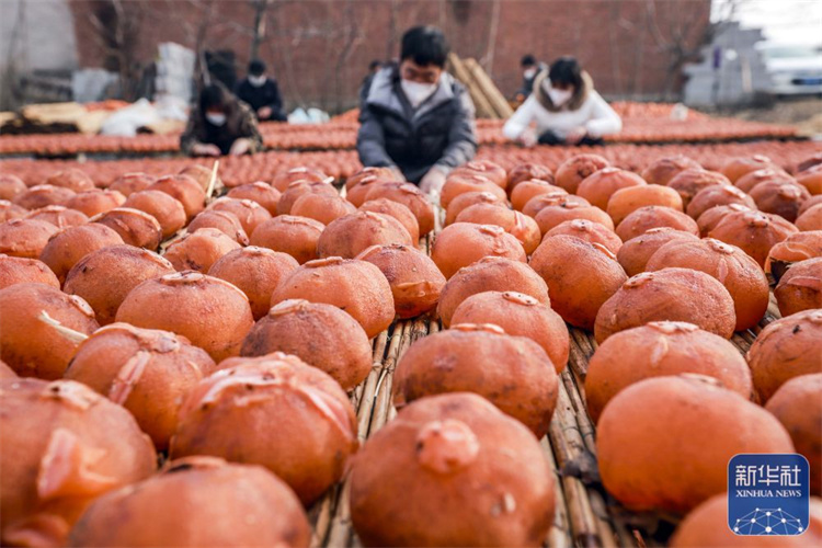 立冬之后,河北省遵化市地北头镇的场院里一片忙碌景象,农民们利用冬闲加工、晾晒柿饼,实现柿子增值,农民增收。该镇年产柿子5300多吨,冬季加工、晾晒柿饼是当地农民致富的一条主要途径。新华社发(刘满仓摄)