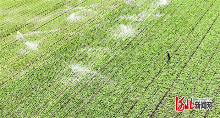 11月28日,遵化市平安城镇农民开启喷灌机浇小麦封冻水。