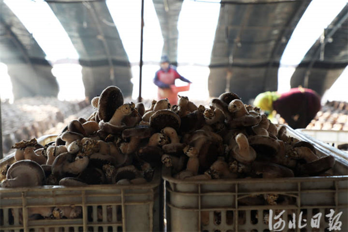 12月6日,唐山市丰润区新庄子村农民在温室大棚内采摘香菇。