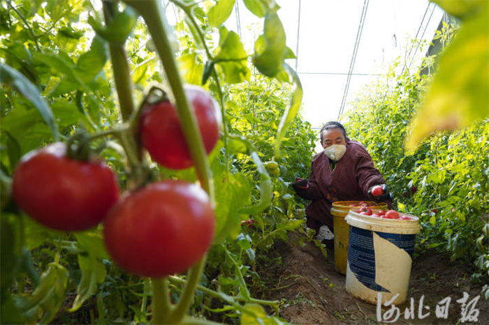 12月6日,邢台内丘县韩郝庄村农民在大棚里收获西红柿。