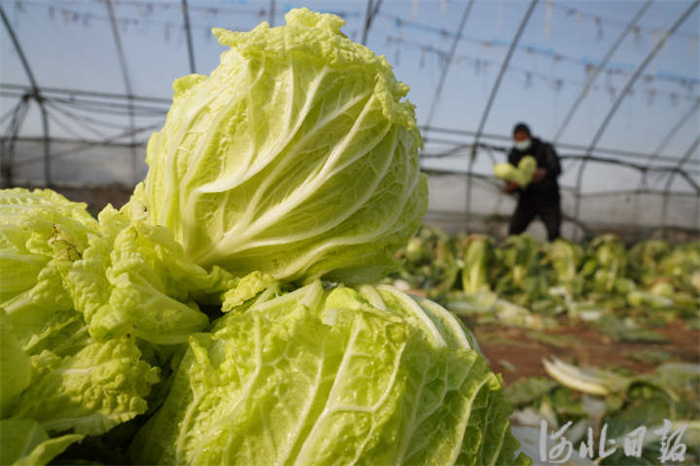 2022年12月6日,邢台内丘县韩郝庄村农民在大棚里收获大白菜。