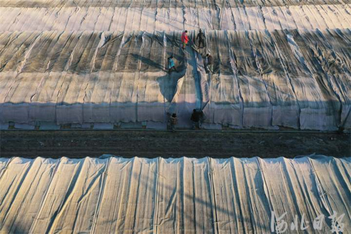 12月6日,唐山遵化市东新庄镇农民在加固大棚保暖设施。