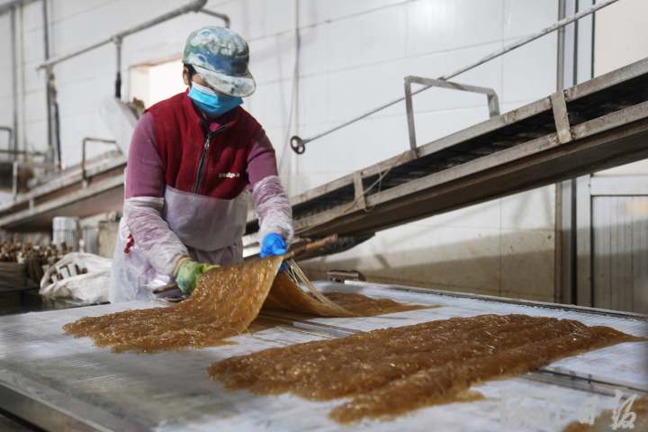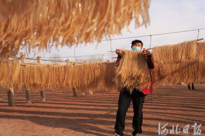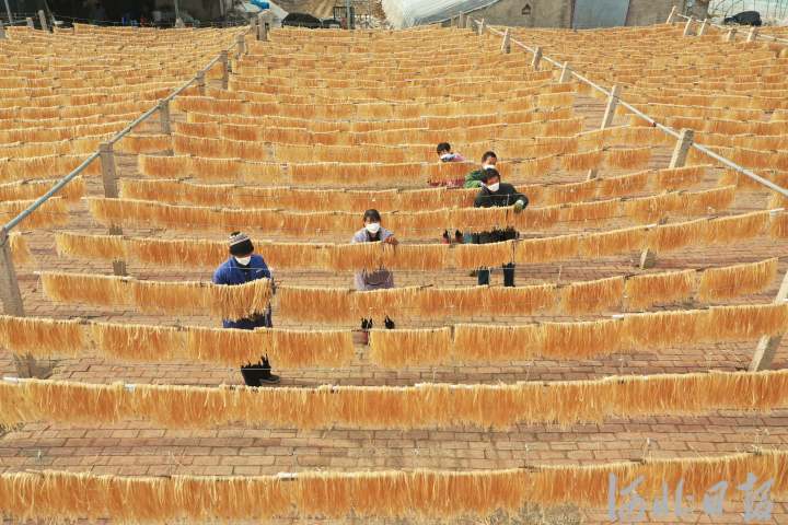 12月7日,遵化市中滩村粉条制作基地,农民在晾晒粉条。