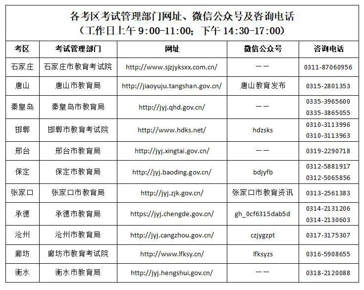 十、其他未尽事宜,考生可直接与考点所在地考试机构联系。各考区网址、微信公众号及咨询电话如下: