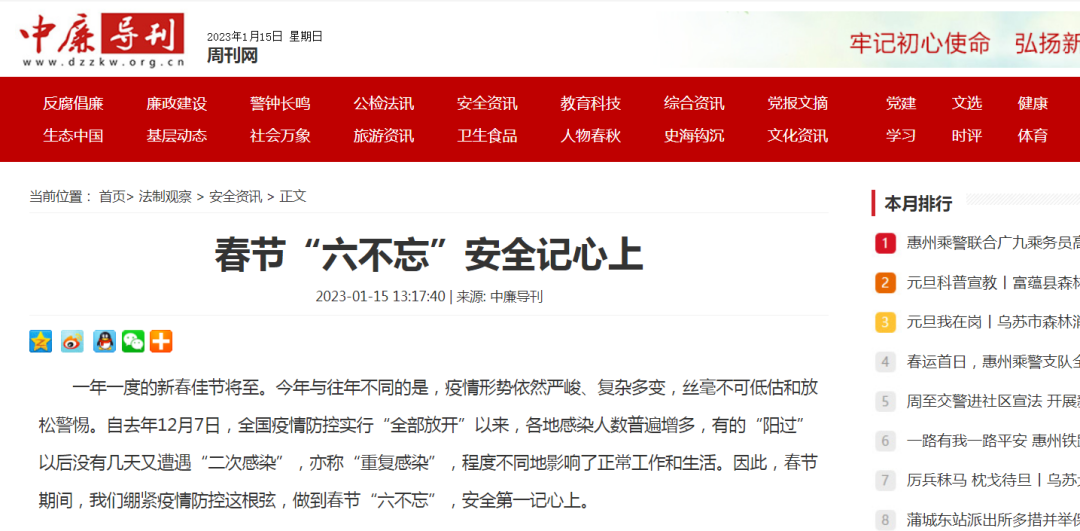 一年一度的新春佳节将至。今年与往年不同的是,疫情形势依然严峻、复杂多变,丝毫不可低估和放松警惕。自去年12月7日,全国疫情防控实行“全部放开”以来,各地感染人数普遍增多,有的“阳过”以后没有几天又遭遇“二次感染”,亦称“重复感染”,程度不同地影响了正常工作和生活。因此,春节期间,我们绷紧疫情防控这根弦,做到春节“六不忘”,安全第一记心上。