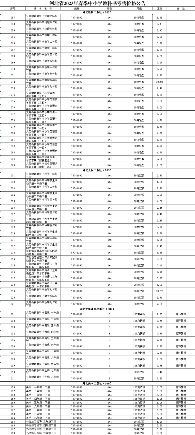 河北省发展和改革委员会最新公布关于公布2023年春季中小学教科书零售价格的公告,根据有关规定,河北省发展和改革委员会会同河北省新闻出版局核定了2023年春季列入河北省中小学教学用书目录的教科书零售价格,现予以公布。↓↓↓