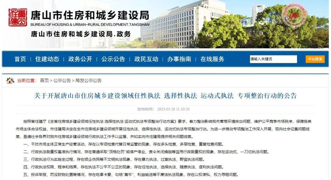 近日,中国唐山网站发布了《唐山市住房公积金管理中心关于公开征集行政执法领域突出问题线索的公告》和《关于开展唐山市住房城乡建设领域任性执法 选择性执法 运动式执法专项整治行动的公告》。详情如下: