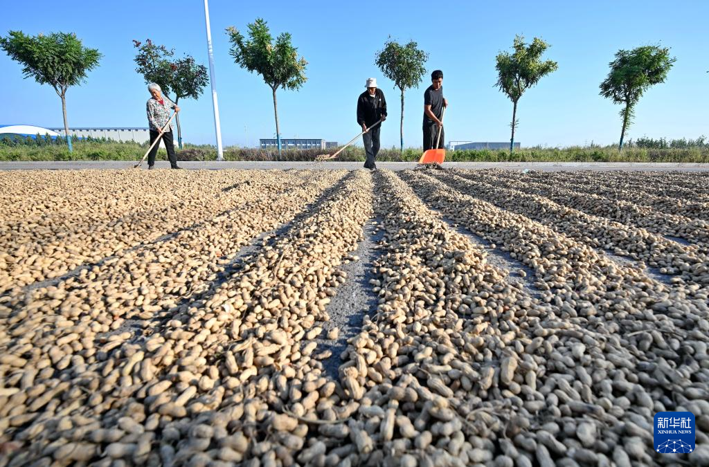 9月17日,滦州市滦城街道百信花生种植专业合作的社员在晾晒收获的花生。