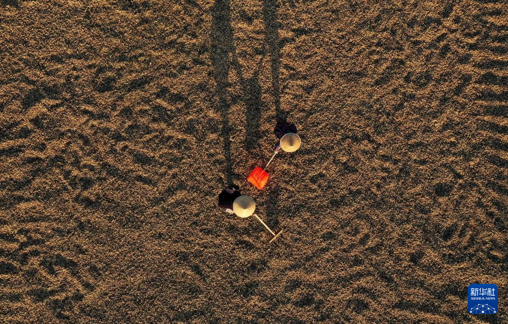 9月17日,滦州市滦城街道百信花生种植专业合作的社员在晾晒收获的花生(无人机照片)。