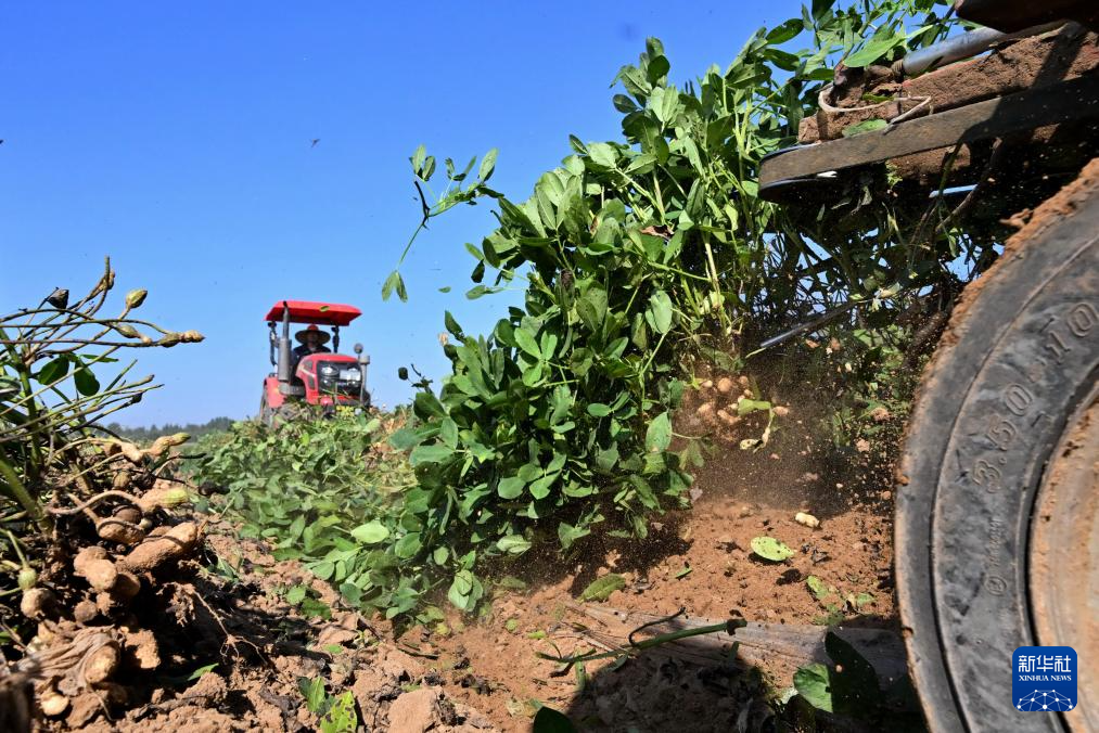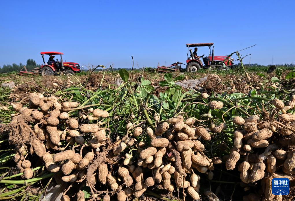 9月17日,滦州市滦城街道百信花生种植专业合作的社员在田间使用机械设备收获花生。