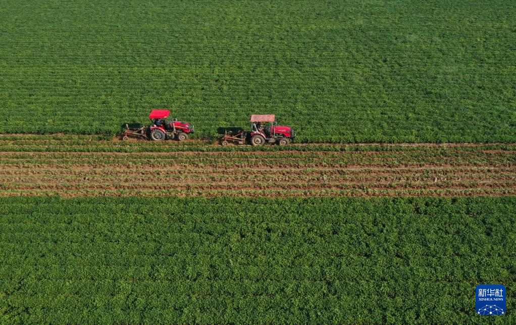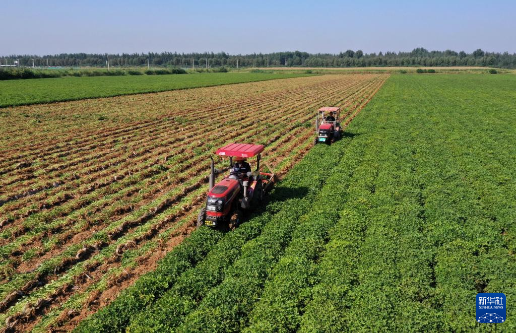 9月17日,滦州市滦城街道百信花生种植专业合作的社员在田间使用机械设备收获花生(无人机照片)。