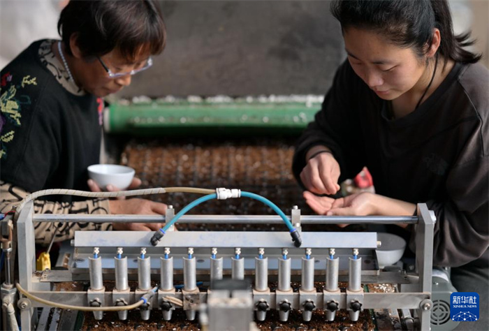 3月10日,河北省唐山市曹妃甸区第六农场一家育苗基地的工作人员往育苗盘上播撒蔬菜种子。