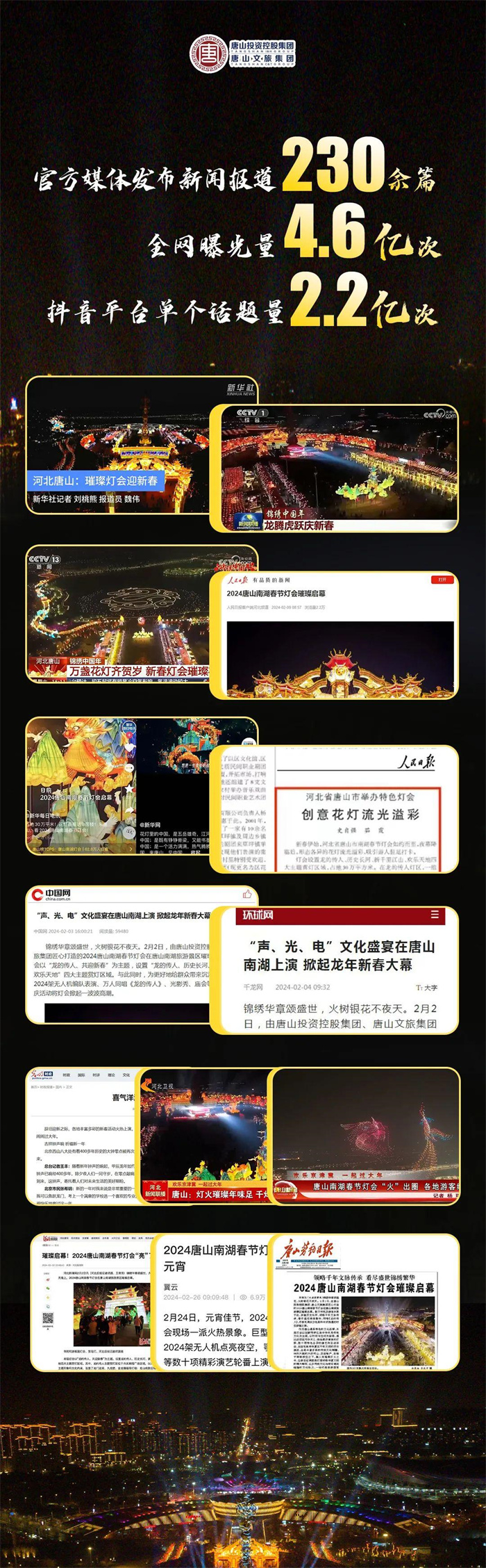 自2月2日璀璨启幕到3月11日圆满落幕,以“龙的传人、共迎新春”为主题2024唐山南湖春节灯会盛誉如潮、强势出圈,向广大游客和市民交出了一份亮眼的成绩单,标注了本届灯会的璀璨成果,为唐山文旅产业融合高质量发展铸就了新的辉煌,也成为唐山投资控股集团、唐山文旅集团奔赴下一场山海的不竭动力!