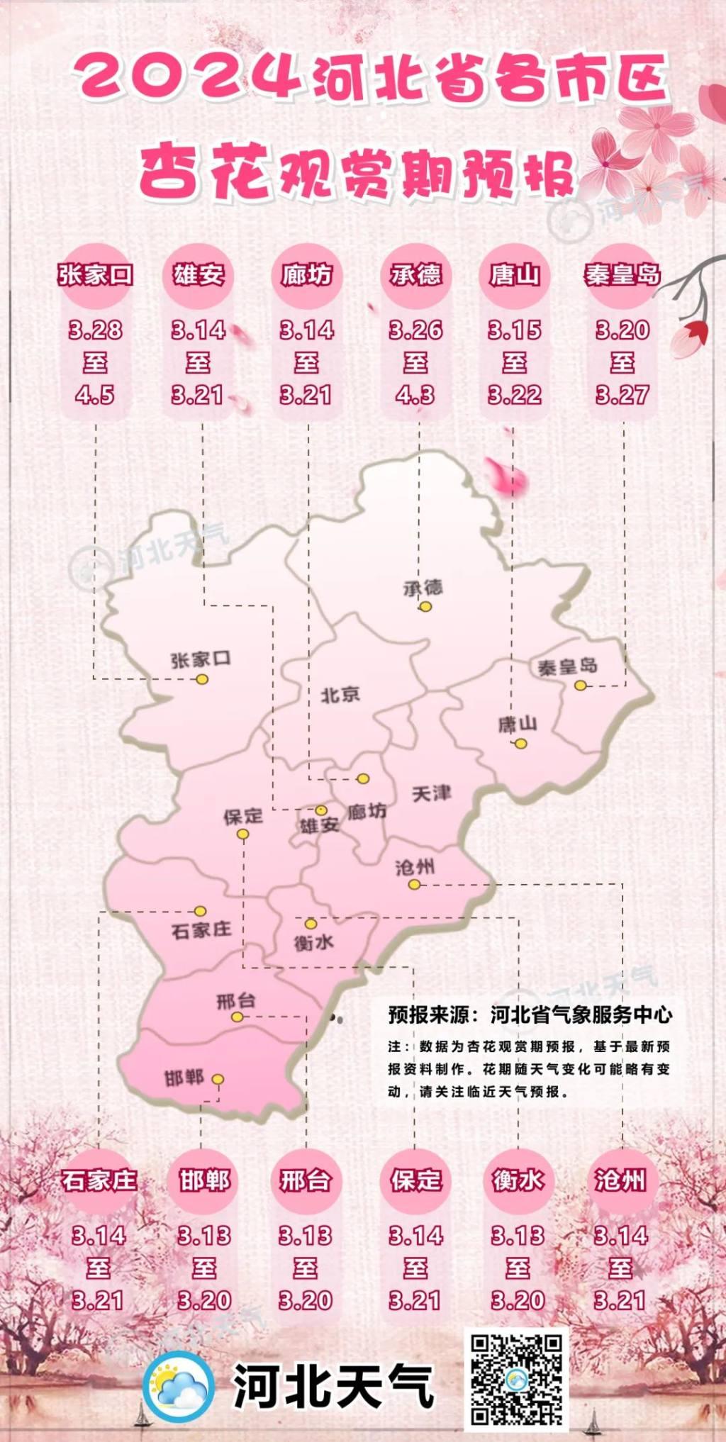 阳春三月,满城春色,我省又到了杏花陆续盛开的时节。3月12日,河北天气公众号发布了“河北省各市区迎春花观赏期预报”,其中唐山的杏花观赏期预计在3月15日至22日。