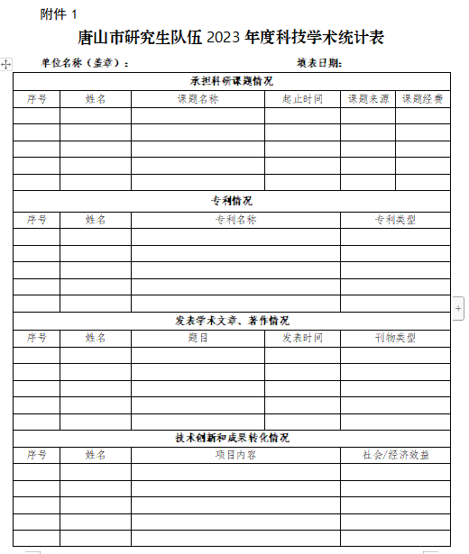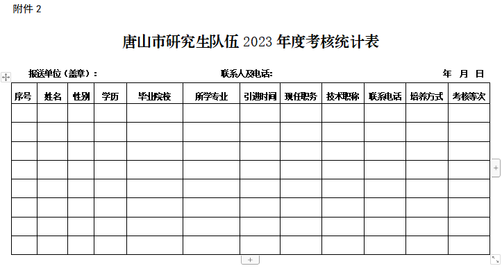 (一)考核工作按“谁使用、谁负责”原则,由各用人单位组织本单位考核工作。其中,《唐山市研究生队伍2023年度科技学术统计表》(附件1)由用人单位组织本单位研究生填写并汇总;《唐山市研究生队伍2023年度考核统计表》(附件2)由用人单位汇总填写并确定考核等次。