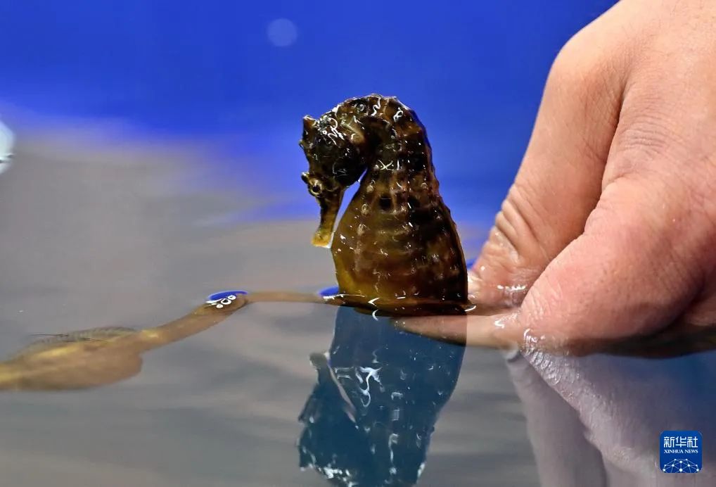 3月19日,河北省唐山市海港经济开发区智慧渔业产业园的工人展示养殖的海马。