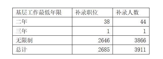 从总体补录职位基层工作最低年限来分析,本次补录以无限制基层工作经验的职位居多,仅有中央财办的1个职位要求考生有三年基层工作经历,另有科学技术部、司法部、国家体育总局等部门提供的38个职位要求考生具有2年基层工作经验。