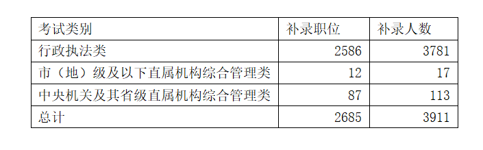 从总体补录职位考试类别来分析,行政执法类是大头,有2586个职位补录3781人,需要考行政执法类试卷,占总人数的96.7%。