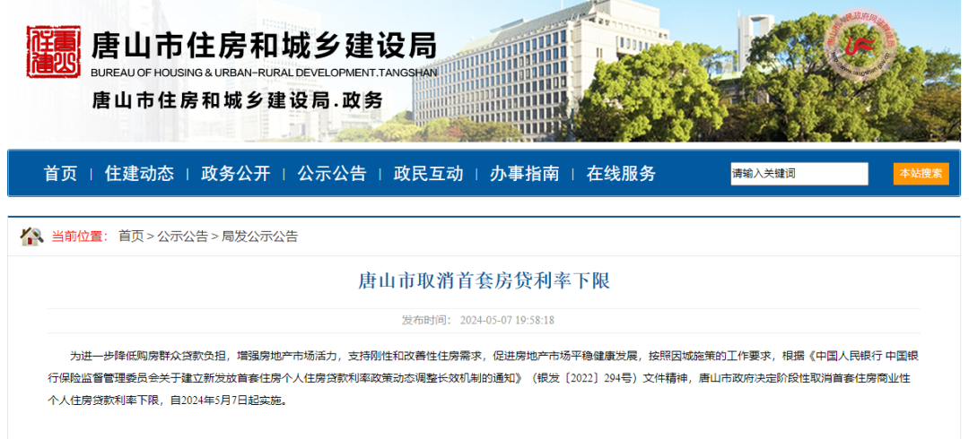 5月7日,唐山市住房和城乡建设局发布《唐山市取消首套房贷利率下限》,详情如下: