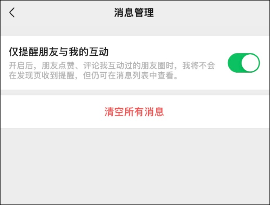 据@冷知识bot :微信更新最新版本,点击自己的朋友圈→点击右上角三点→点击消息列表消息管理→打开“仅提醒朋友与我的互动”。