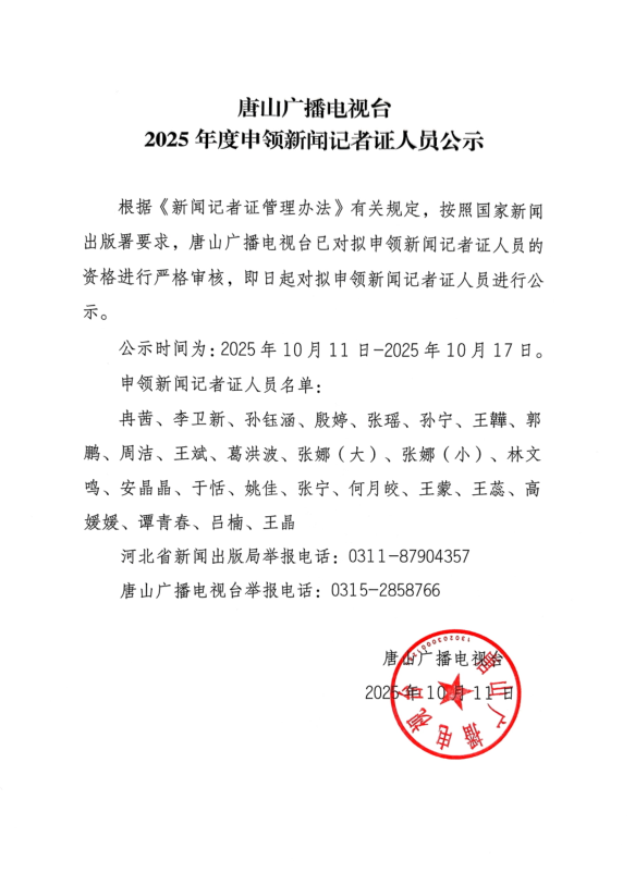 根据《新闻记者证管理办法》有关规定,按照国家新闻出版署要求,唐山广播电视台已对拟申领新闻记者证人员的资格进行严格审核,即日起对拟申领新闻记者证人员进行公示。